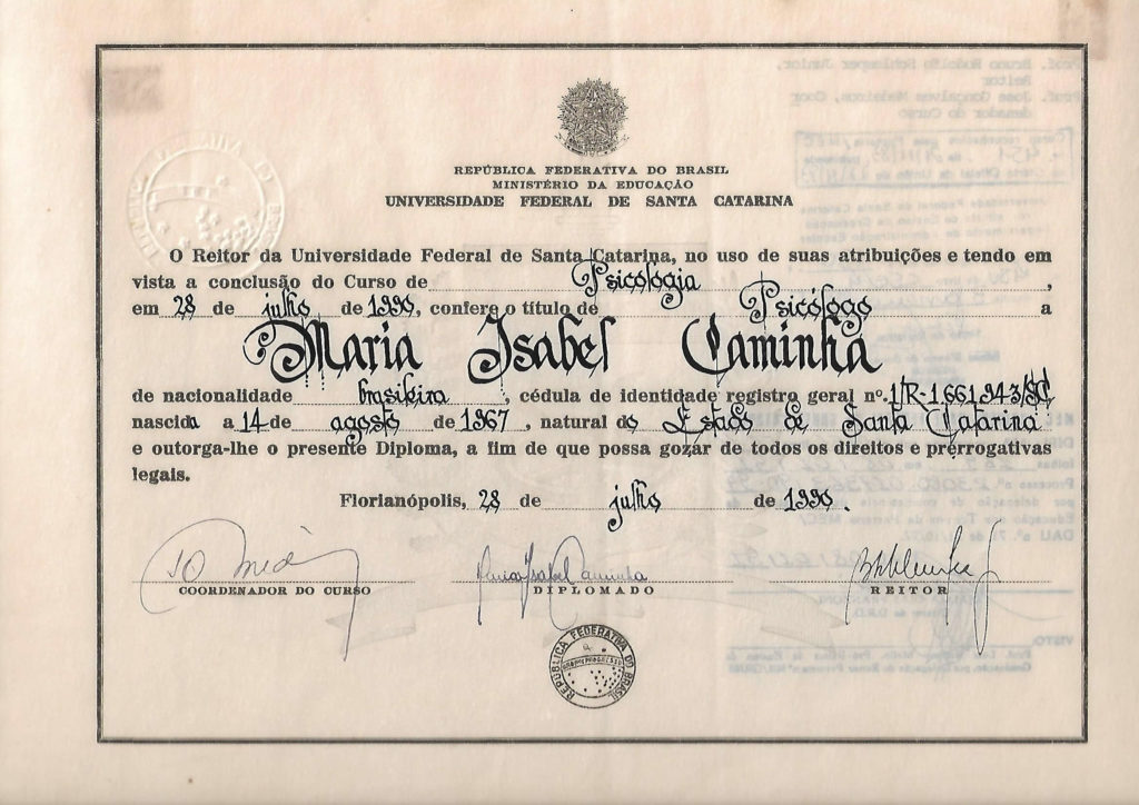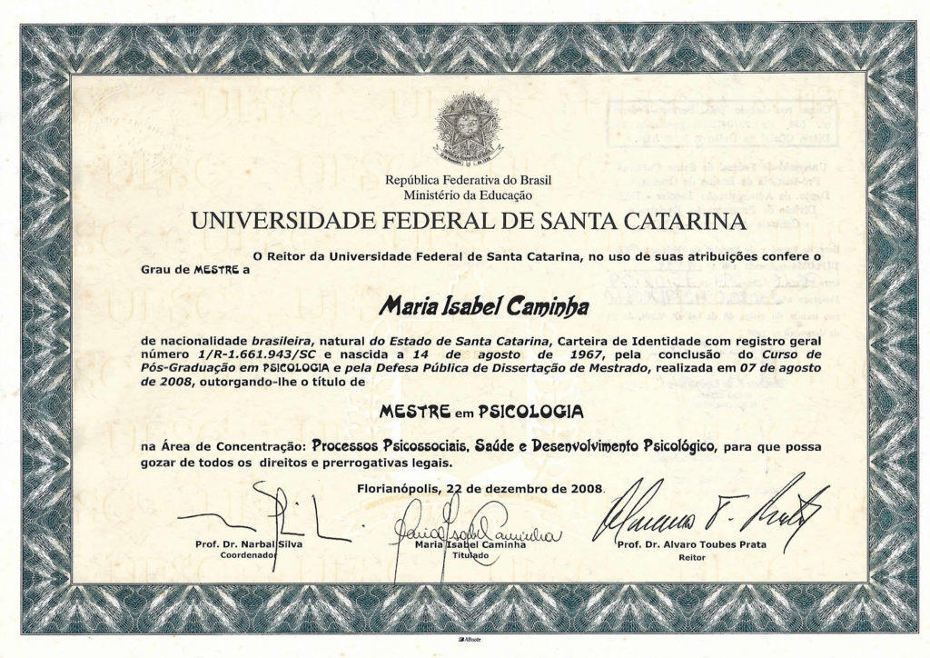 Mestre em Psicologia pela UFSC (Área de Concentração: Processos Psicossociais, Saúde e Desenvolvimento Psicológico);